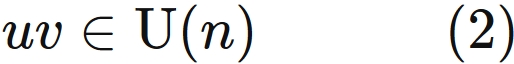 1. $\mathrm{U}(n)$ の任意の元の積もまた $\mathrm{U}(n)$ の元になる ( $(2)$ のこと )。